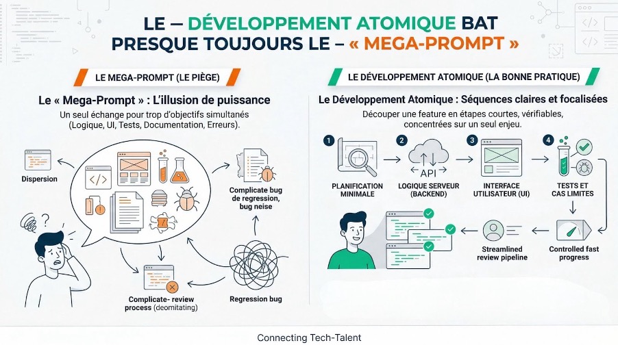 Le mega-prompt donne une illusion de puissance. Il concentre surtout trop d’objectifs dans un seul échange : logique métier, UI, tests, validation, documentation, gestion d’erreurs.
