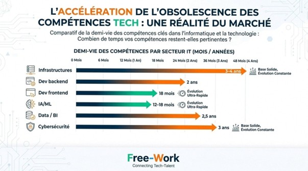 En 2024, elle se situe entre 12 et 24 mois, avec une demi-vie estimée à 2 à 2,5 ans dans les métiers les plus dynamiques (dev, data, cloud, IA).