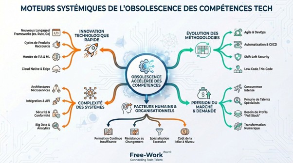 L’obsolescence des compétences IT ne repose pas sur un unique facteur. Elle résulte d’un écosystème instable, alimenté par quatre dynamiques interdépendantes.