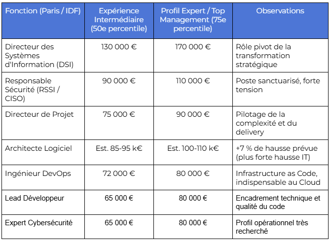 Les données prévisionnelles de Robert Half pour 2026 mettent en évidence une inflation salariale ciblée sur les profils stratégiques. Les entreprises sont prêtes à payer le prix fort pour sécuriser les compétences qui garantissent leur résilience (Cyber) ou leur futur (IA, Architecture).