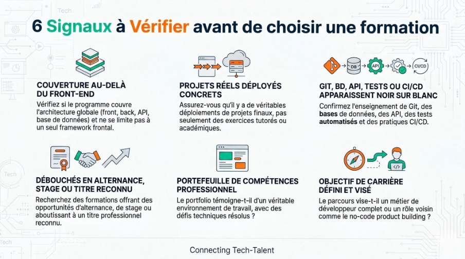 Le marché n’attend pas des juniors « formés au code » au sens vague. Il attend des profils qui savent déjà transformer un besoin en livrable, documenter un projet, comprendre une stack, versionner proprement, corriger, tester, déployer. Entre la brochure et le poste, l’écart reste large. Les six parcours ci-dessus ont tous une utilité. Ils ne racontent simplement pas le même métier.