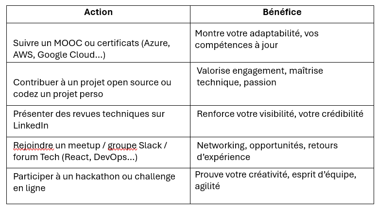 Le premier réflexe est souvent de se décourager. Pourtant, ce silence peut être lié à des processus de recrutement complexes - plusieurs couches de validation, comités internes, calendrier budgétaire ou priorités changeantes. En attendant, transformez ce temps en un levier - pensez mini-projets, veille technologique, formation en ligne (MOOC en IA, en cloud, sécurité, etc.). Vous manifestez ainsi une véritable proactivité, un atout rare, même avant l’entretien.
