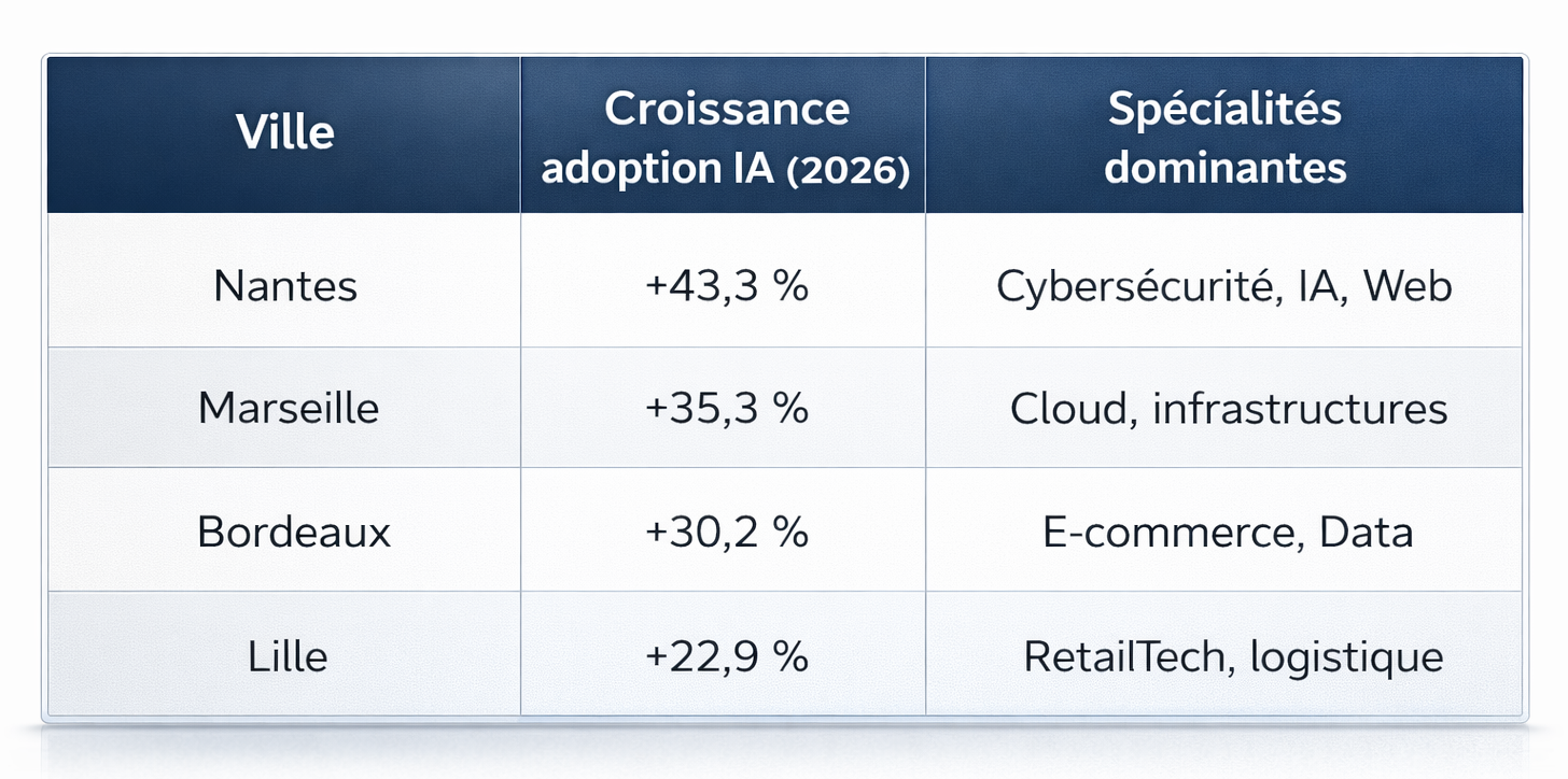 Au-delà des grands pôles, certaines villes affichent une progression spectaculaire de l’adoption de l’IA au travail, créant un terrain favorable aux missions IT de pointe.