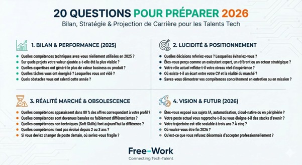 Bilan professionnel dans la Tech : 20 questions puissantes pour préparer son année 2026