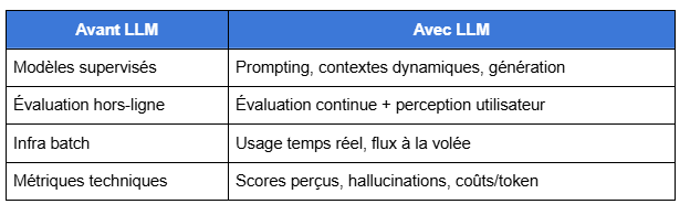 Avant, on entraînait un modèle supervisé, on mesurait ses performances avec des métriques classiques (AUC, F1, RMSE), et l’infra tournait en batch.