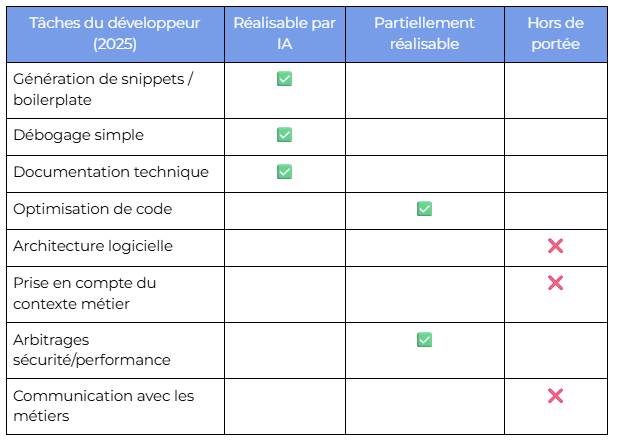 Enfin, le développement reste un travail d’équipe. Les compétences pédagogiques — expliquer un concept complexe à un product owner, encadrer des juniors, vulgariser une contrainte technique — échappent, évidemment, à l’IA.